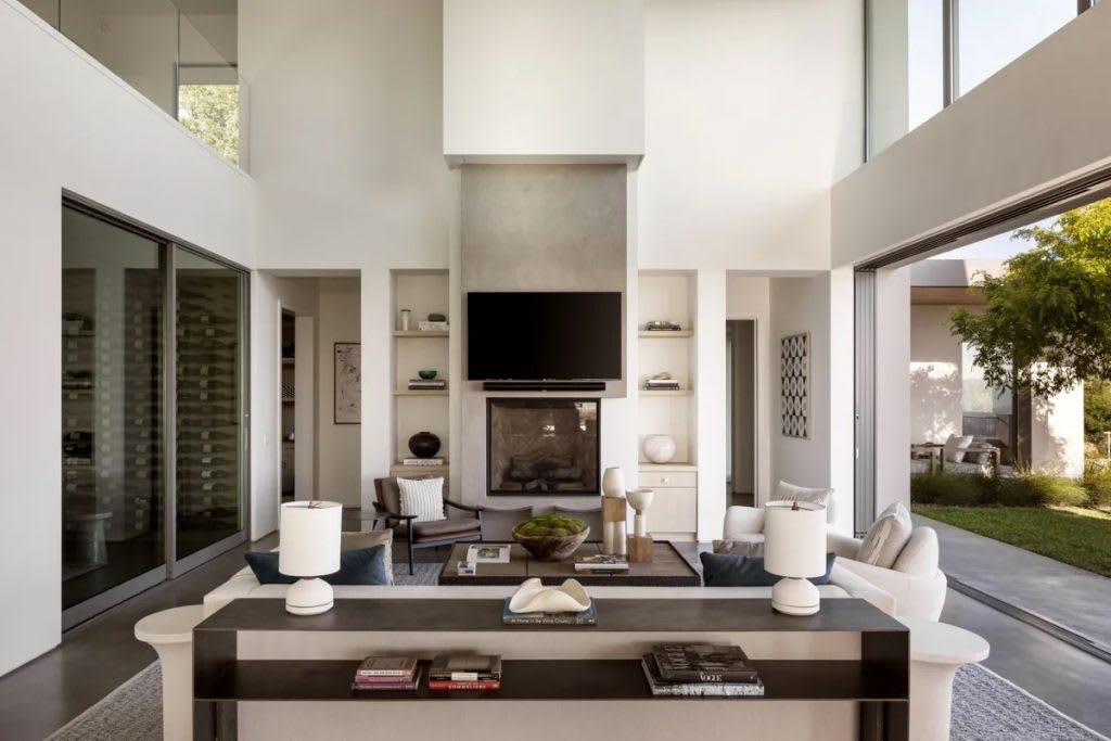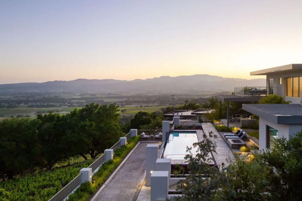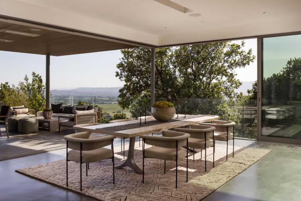 “Indoor-outdoor living” is a phrase regularly applied to many homes in California, where the idyllic temperate climate not only allows for but encourages time divided between stylish interiors and the open air and sunshine. Here, on a hillside in Napa’s revered wine country, the concept takes on a new, deeper meaning. From nearly every vantage point in the airy 5,415-square-foot floor plan, the boundary between indoors and out begins to disappear, with expanses of glass offering perhaps the most spectacular vistas in Napa and creating a sense that walls might not be there at all. The cinematic scenery becomes a form of art, practically pleading for a life lived in the outdoors—or at least one with magazine-worthy views of it.
